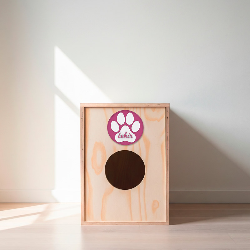 Kedi evi için ideal ( Arkasında bulunan çift taraflı bant ile kolayca uygulanır. İstenilirse size özel vida deliği açabiliriz. Dekor üzerine istenilen isim yazılabilir)